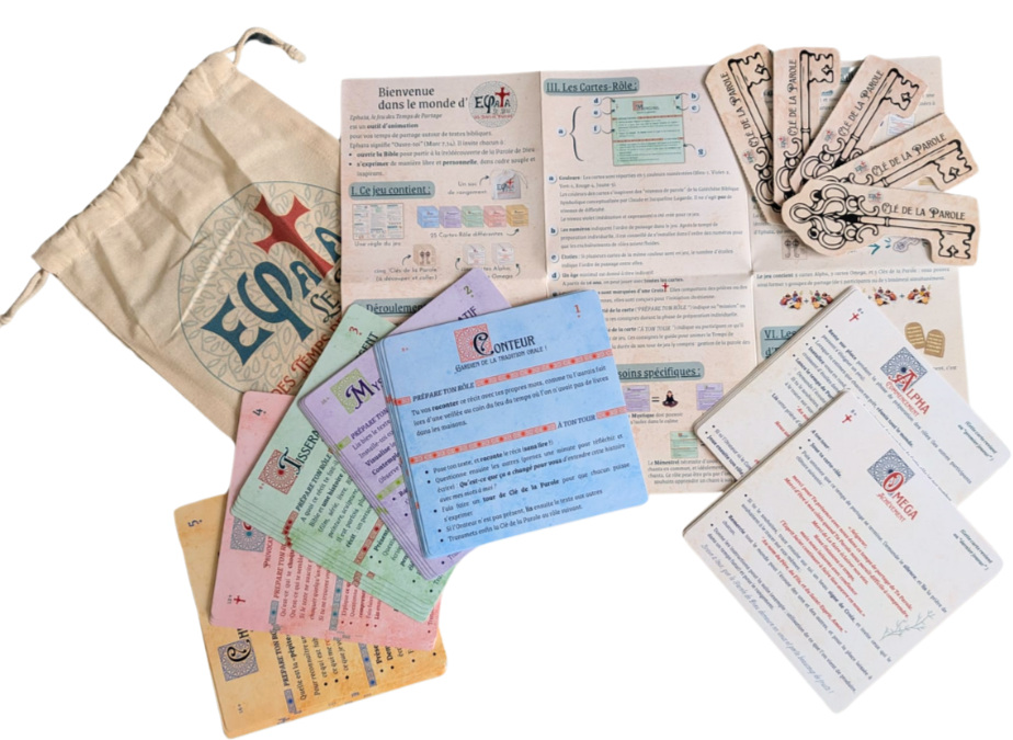 J’ai eu l’idée de regrouper dans une sorte de “boîte à outils” différentes façons d’approcher, de comprendre, de méditer, d’explorer, d’approfondir un texte biblique : les cartes-rôles étaient nées. La particularité du jeu Ephata, c’est de faire tenir ces différents rôles par les participants eux-mêmes, et ce, dès 8 ans (progressivement). Cela permet :- de favoriser la prise de parole de chacun, dans un cadre balisé mais très ouvert. C’est en effet par une parole personnelle que l’on s’approprie la Parole de Dieu.- d’améliorer l’écoute mutuelle et la participation, notamment chez les adolescents, puisque les différentes missions leurs sont proposées par leurs pairs.- de former les participants eux-mêmes aux techniques d’animation de temps de parole, pour qu’ils deviennent à leur tour pleinement prophètes !